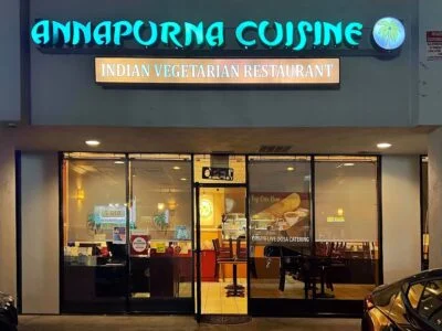 Pure vegetarian South Indian specialist recognized by Gayot as a Top 10 LA Indian restaurant, operating since the early 2000s with Chennai-style specialties. Each lunch buffet patron receives a complimentary dosa delivered tableside, while the kitchen rotates daily specials that showcase regional breadth. The space includes Bollywood videos on screens and a modern casual atmosphere that draws fifteen-year regulars.