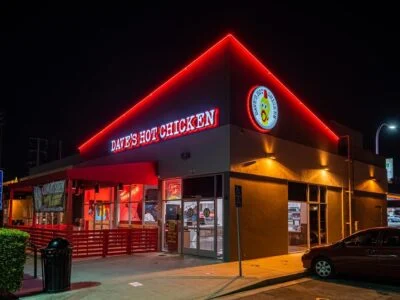 LA-born Nashville hot chicken chain that started as an East Hollywood parking lot pop-up in 2017, now serving halal-certified tenders and sliders across seven heat levels. The hand-breaded chicken delivers consistent crunch and spice calibration, with late-night hours appealing to post-event crowds.