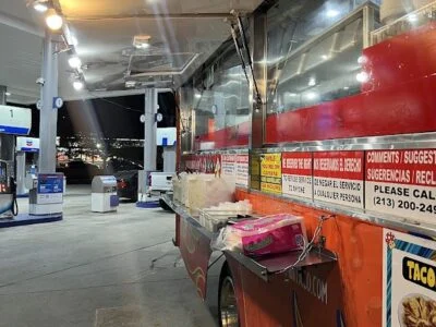 Bright red food truck with neon signage serving al pastor from a flaming trompo alongside extensive meat and vegetarian options. Open late for the Echo Park crowd, with fresh toppings including pico de gallo, pickled onions, and multiple house-made salsas that complement their tender, well-seasoned proteins.