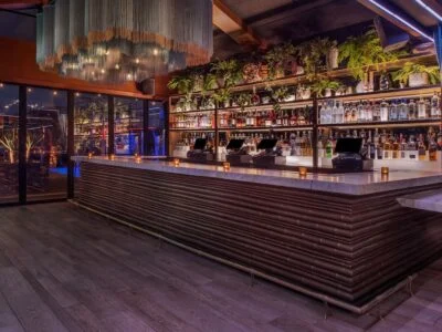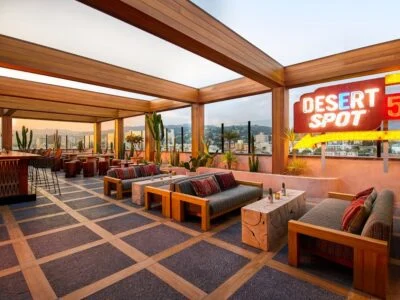 Desert 5 Spot is a 1970s desert motel-inspired rooftop bar and taco spot atop the tommie Hollywood hotel, with live country-leaning music and neon-lit views. The menu leans into margaritas, nachos, and tacos rather than full entrées, but it’s one of the more distinctive, music-forward rooftop hangs in 90028.