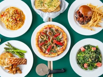 BBQ Chicken Pizza, Garlic Shrimp Pizza, Bleu Burger